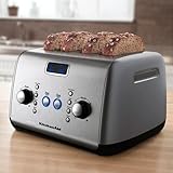 The toaster ahead of its time, this KitchenAid, 4-slice toaster features a blue backlit LCD display highlighting the shade level of browning, and countdown to serving time. Engineered to recall and display the last shading level and function, this contemporary appliance toasts to exact standards every time. Change the shade level using the dial that adjusts from 1-7 settings for precise browning. Using the one-touch motorized control, you can raise or lower bread at the touch of a button. The extra-wide 1 1/2" slots feature interior racks that self-adjust, centering the rack width to keep thick or thin slices of bread, bagels, pastries or English muffins upright for even toasting.