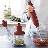 No more messy transfer of soups, purees and sauces from pot to blender. With a powerful motor, rugged stainless steel blending attachment, and a 5' cord, this hand-held blender provides versatility and mobility. The 8" immersion depth reaches the bottom of tall stockpots and pitchers. Press-and-hold operation with speed control. Whisk, 4-piece chopper attachments and blender beaker included. Dishwasher-safe attachments. Wipe body clean.